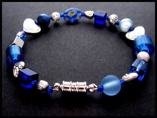 Blauer Armreif mit silberfarbenen Herzen und blauen Perlen ...romantisch verspieltes Trachtenarmband Unikat Blauer Armreif mit silberfarbenen...