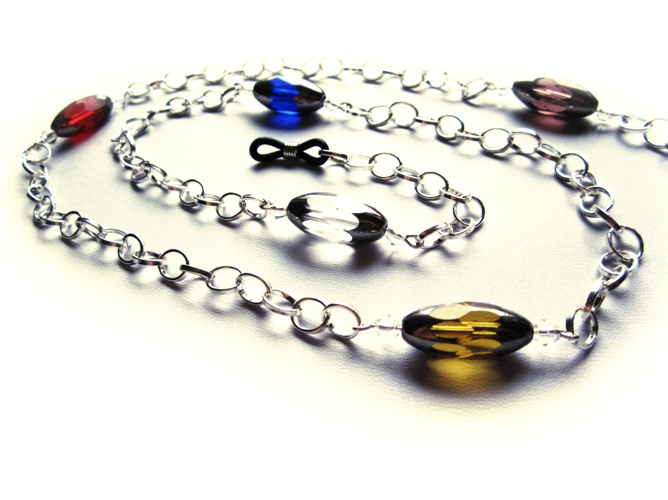 Silberfarbene Brillenkette aus größeren Gliedern mit verschiedenfarbigen großen, geschliffenen Glaskristallperlen mit silberfarbener Gliederkette mit grossen Ösen. Die Glasperlen haben die Farben Siamrot, Kobaltblau, honigfarben, amethyst und weiss und besitzen silberfarbene Enden.
