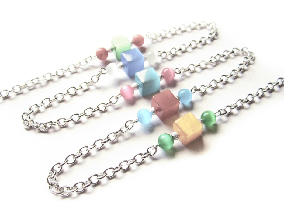 Brillenkette aus verschiedenfarbigen kugel- und würfelförmigen Glasperlen mit Katzenaugen-Effekt und hellsilberfarbener (platinfarbener) Gliederkette.
