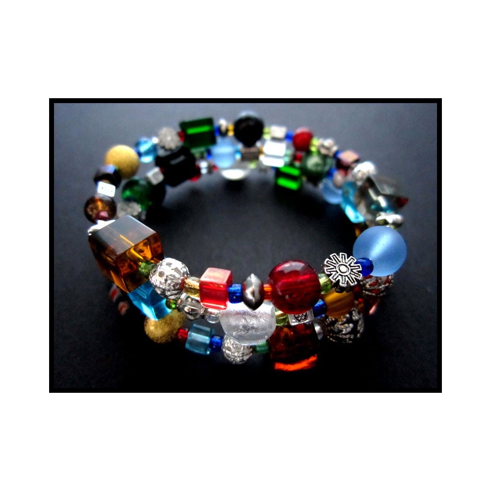 Flexible Armspirale, bzw. Wickelarmband in drei Reihen aus wunderschönen Glas Perlen, anderen farbigen Glasperlen, wie z.T. Millefiori, goldfarbenen Metallperlen und Elementen aus Legierung. Das Armband hat keinen Verschluss, es lässt sich einfach über die Hand streifen.