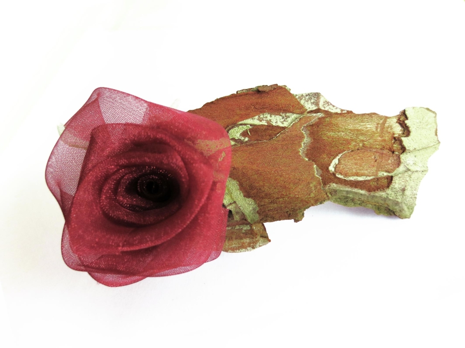 Ausgefallene, rotbraune Haarspange, bestehend aus braun weisser Rinde und roter Rose aus Tüll mit grünen Blättern, ebenfalls aus Tüll.