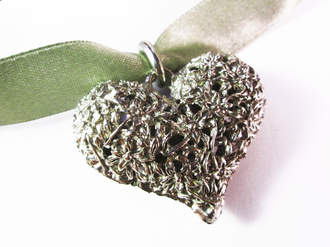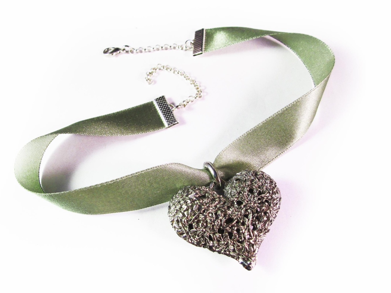 Grünes Kropfband, bzw. Halsband aus Satin, mit einem großen, bauchigem filigranen Trachtenherz Anhänger in silberfarben. Das grün silberfarben Halsband wertet nicht nur jedes Dirndl auf. Geschlossen wird das Halsband mittels eines Karabinerhakens.