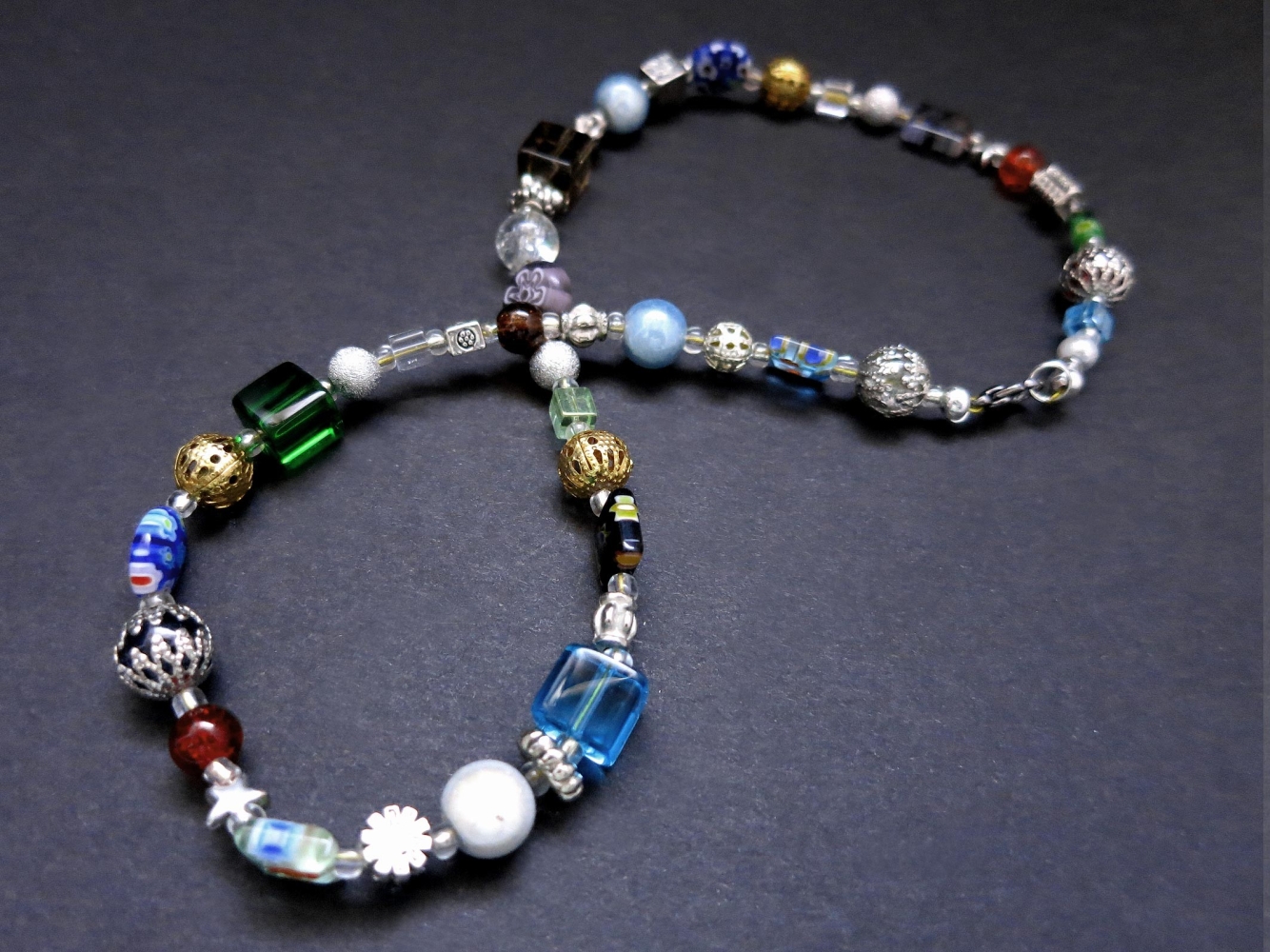 Verschiedenfarbige Glasperlen mit silberfarben- und goldfdarbene Metallperlen aus Metall machen diese bunte Halskette aus. Die irisierenden Miracleperlen mit (ausnahmsweise) Acrylüberzug verleihen der Kette einen geheimnisvollen Glanz.