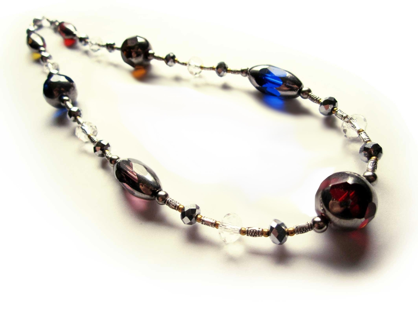 Filigrane Halskette aus farbigen, großen Glasperlen mit silberfarben Polen, kleineren geschliffenen Glasperlen und kleinen silberfarben- und goildfarbenen Metallelementen.