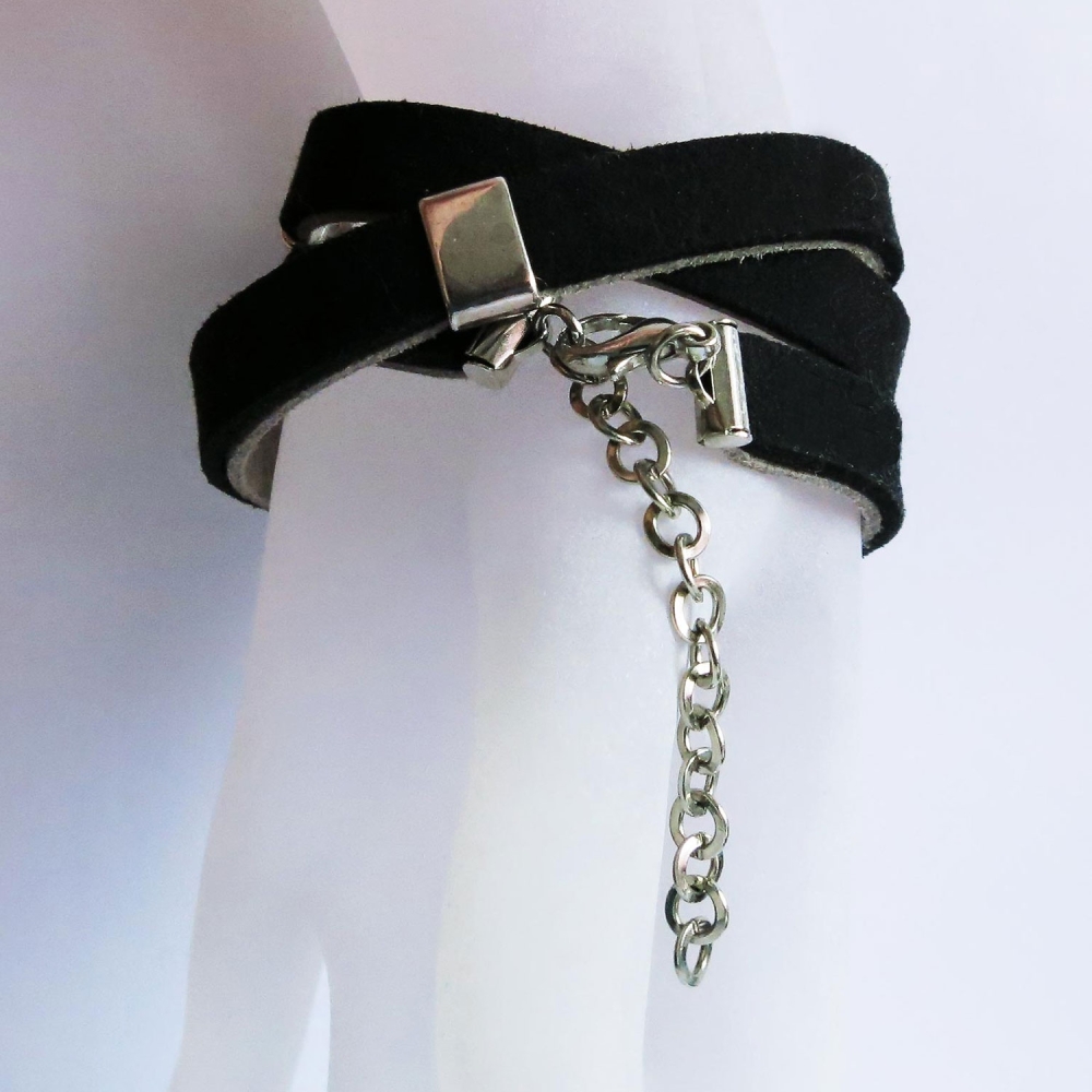 Grau schwarzes Lederarmband, dreifach gewickelt, aus Wildlederimitat. Das vegane Lederarmband besitzt einen silberfarben Karabinerhaken, plus Verlängerungskettchen, zum Schliessen des Armbandes. Auf die Bänder sind flache, silberfarbene Perlen gezogen.
