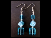Türkisfarbene Ohrringe mit Millefiori Glasperlen in diagonal aufgefädelter Würfelform und türkis transparenten Glas Würfeln. Die Ohrhänger sind an versilberten Ohrhaken angebracht.