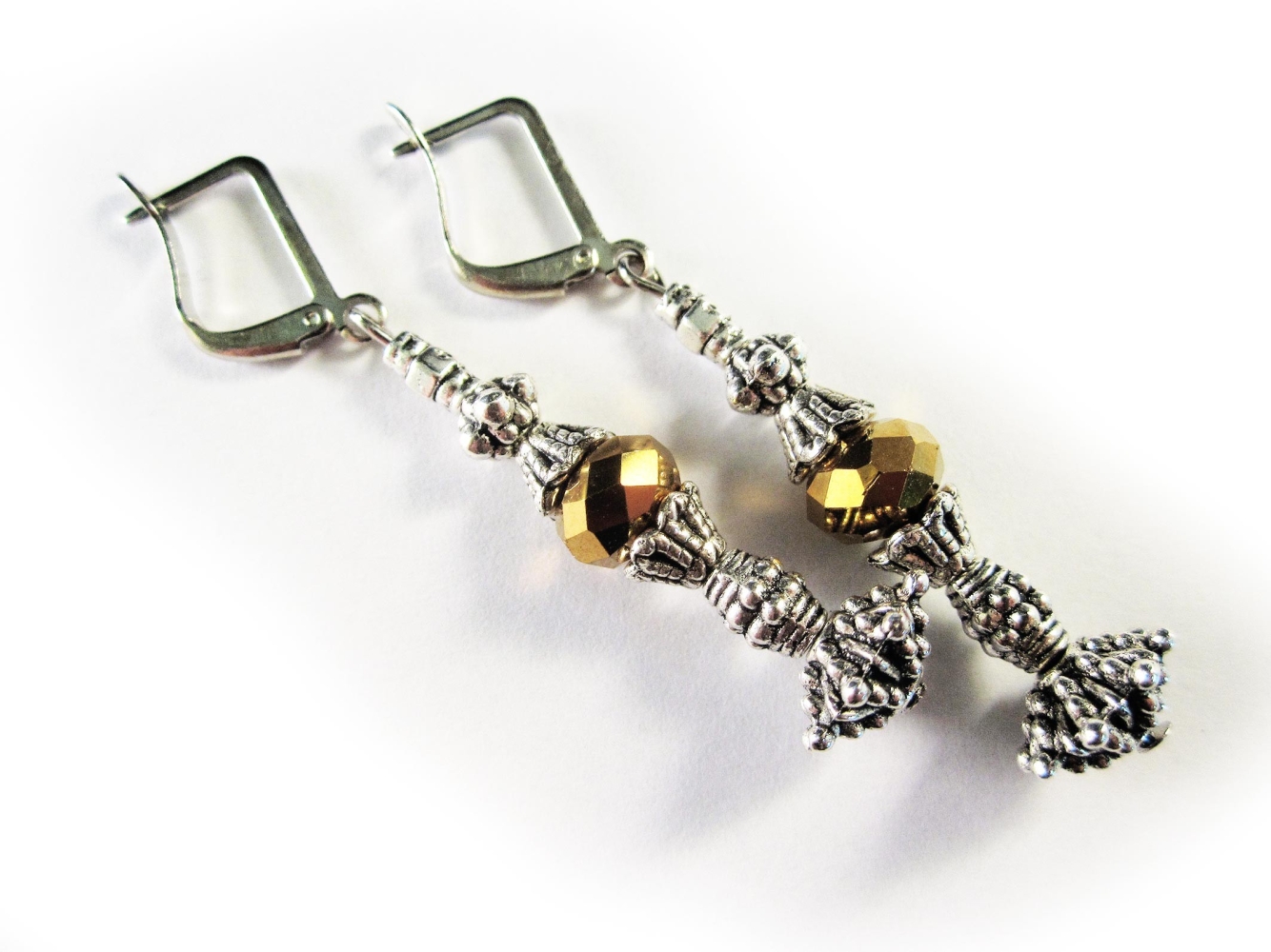 Filigrane Ohrringe aus goldfarbenen, geschliffenen Glasperlen und silberfarben Metallperlen aus silberfarben Elementen.