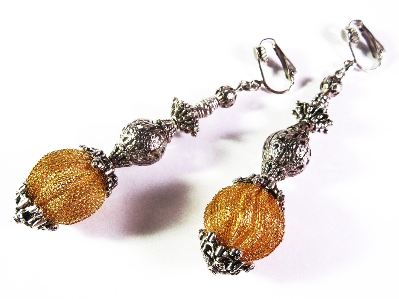 Ein Paar silberfarbene Barock-Ohrclips mit Anhängern mit großer goldfarbener Drahtgeflecht Kugel und filigranen Elementen aus silberfarben Elementen als moderner Trachtenschmuck. Die große goldfarbene Kugel ist aus Metallgaze, somit haben die opulenten Ohrhänger kein allzu großes Gewicht.