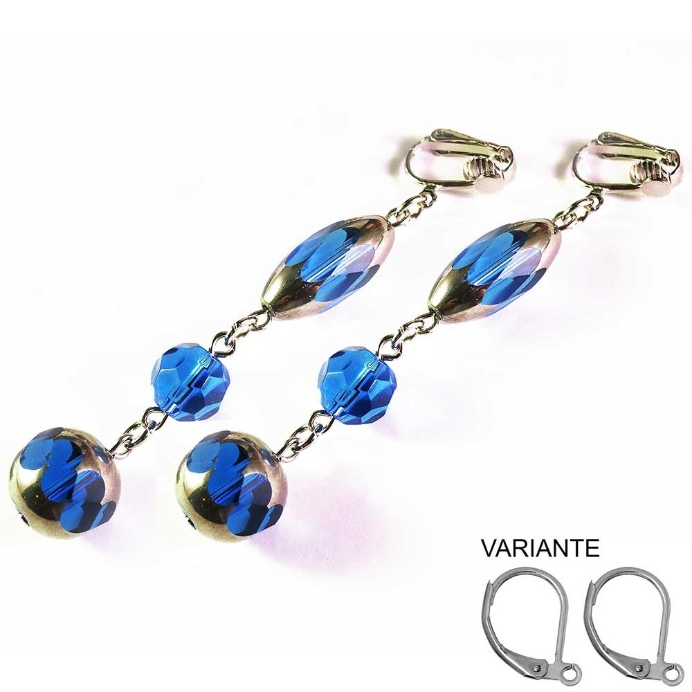 Lange, blaue Glas Ohrhänger als Durchzieher oder Ohrclip ausgeführt. Zwei der drei bauchigen, blauen Glas Perlen haben einen feinen Silberrand. Alle Perlen sind flexibel aufgehängt.