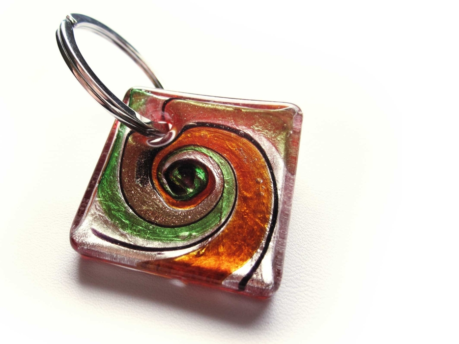Quadratischer Schlüsselanhänger aus Glas mit roter Rückseite und bunter Front mit gold- und silberfarben Einflüssen. Das Motiv ist ein Strudel. Der Schlüsselanhänger wird zusammen mit einem grossen silberfarben Schlüsselring geliefert.
