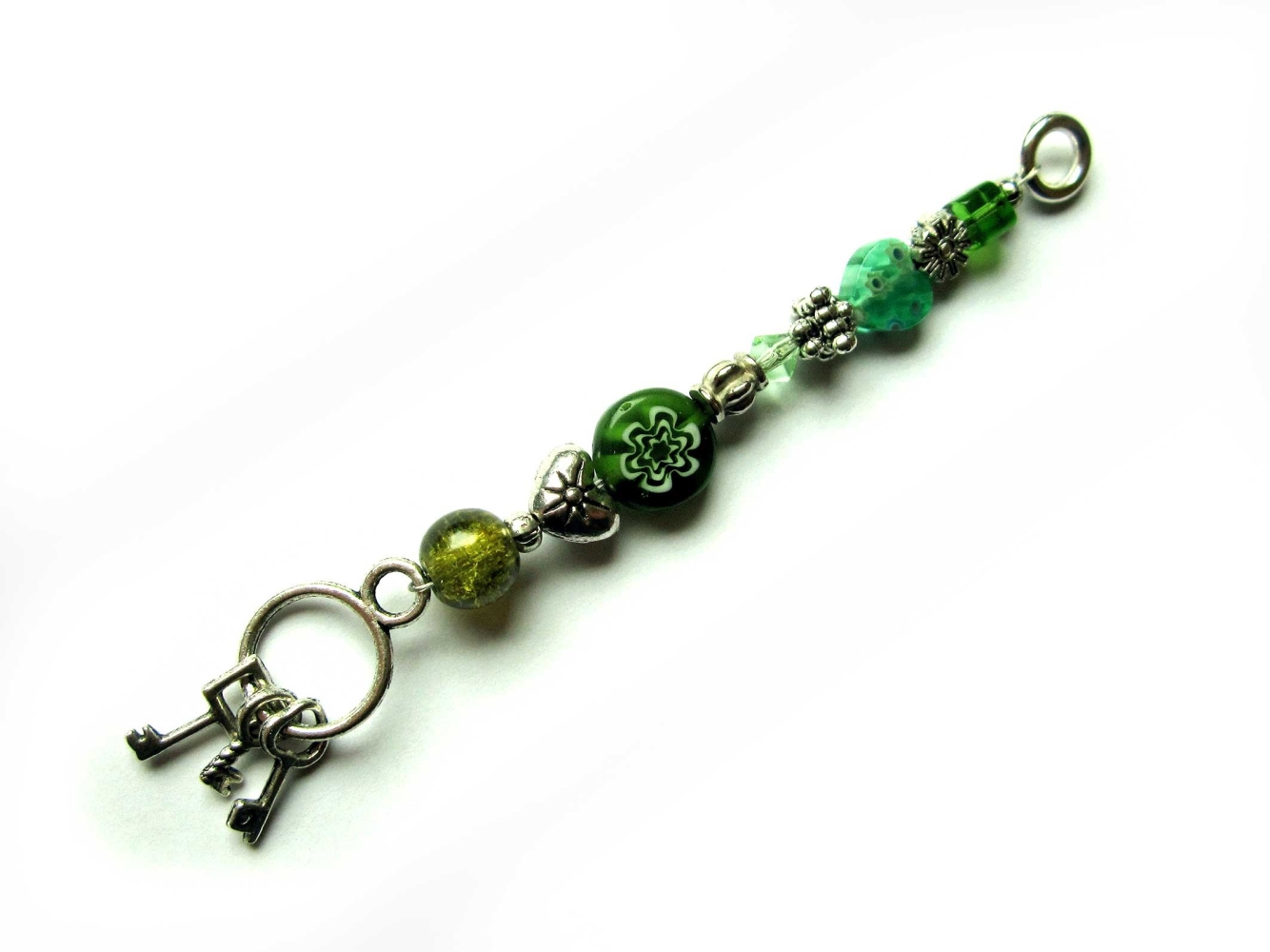 Dies ist ein einzelner Schweif vom Sternenschweif Schlüsselanhänger. Er besteht aus grünen transparenten Glasperlen, in Abwechslung mit silberfarben Metallperlen und Millefioriperlen. Am unteren Ende befindet sich ein kleiner Anhänger in Form eines Schlüsselbundes mit drei kleinen Schlüsseln.