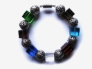 Einreihiger Armreif mit bunten Glas Würfeln und filigranen Metallperlen in altsilberfarben. Die Farben der Würfel aus Glas sind rauchglas, türkis, braun, weiss transparent, blau, amethyst und flaschengrün.