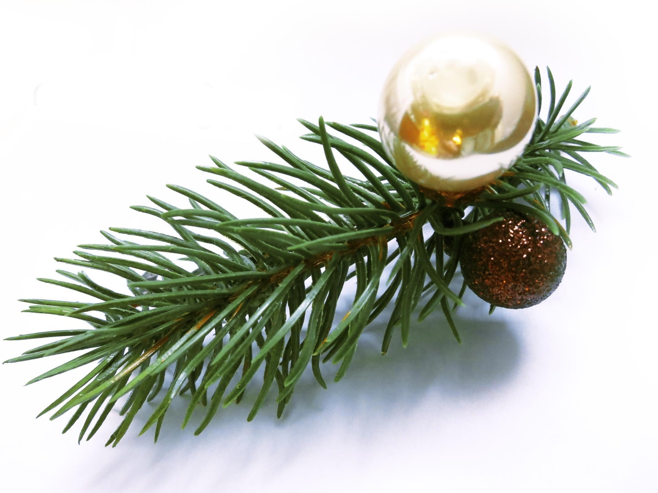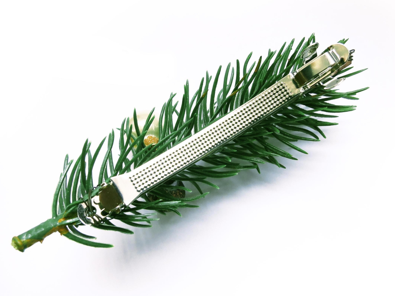 Große, braun- cremefarbene Haarspange für die Weihnachtszeit. Die kleine Weihnachts Haarklammer besteht aus einem künstlichen grünen Tannenzweig und zwei Christbaumkugeln.